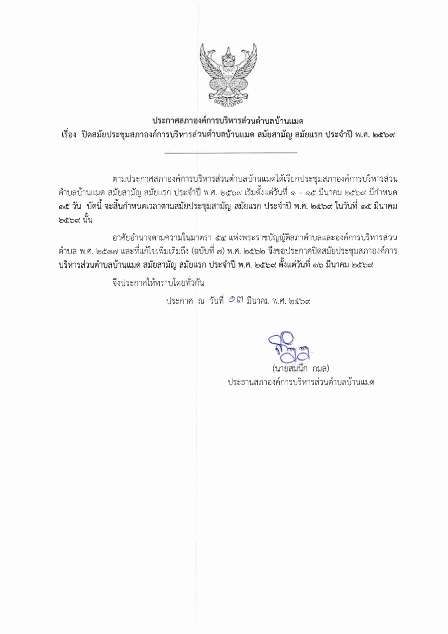 ประกาศปิดสมัยประชุมสภาองค์การบริหารส่วนตำบลบ้านแมด สมัยสามัญ สมัยแรก ประจำปี พ.ศ.2569 วันศุกร์, 13 มีนาคม 2569 15:00 Print Email back to top