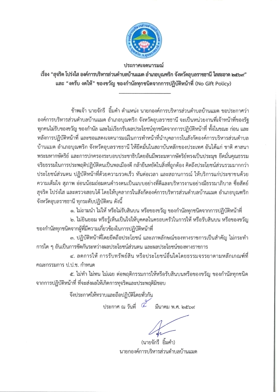 ประกาศเจตนารมณ์ เรื่อง สุจริต โปร่งใส องค์การบริหารส่วนตำบลบ้านแมด ใสสะอาดและงดรับ งดให้ ของขวัญของกำนัลทุกชนิดจากการปฏิบัติหน้าที่(No Gift Policy) วันพฤหัสบดี, 05 มีนาคม 2569 11:32 Print Email back to top