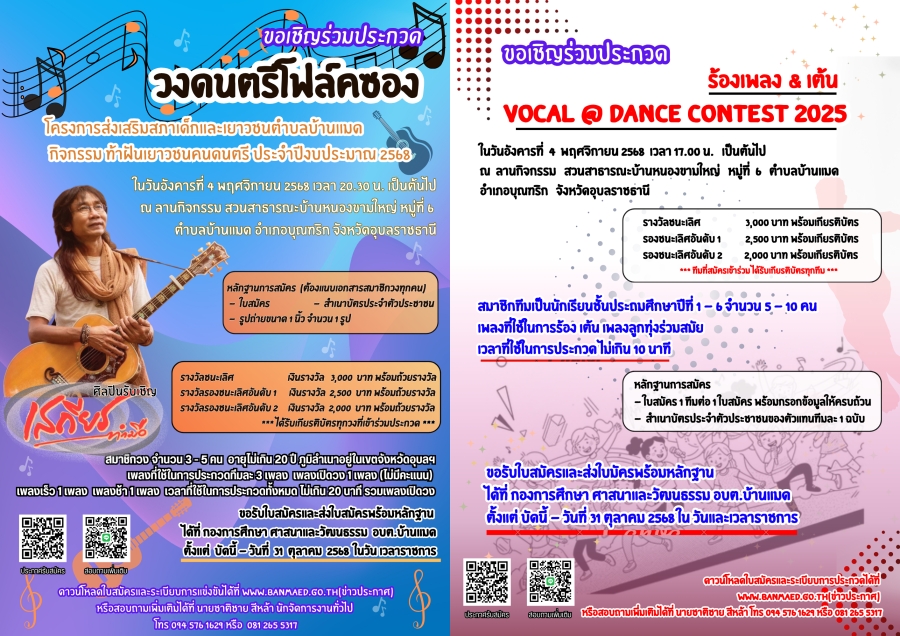 ประกาศรับสมัครประกวดแข่งขัน วงดนตรีโฟล์ซอง และ ประกวดร้องเต้น KID TALENT 2025 วันอังคาร, 07 ตุลาคม 2568 11:44 Print Email ดาวน์โหลดเอกสาร ระกาศรับสมัครประกวดแข่งขัน วงดนตรีโฟล์ซอง และ ประกวดร้องเต้น KID TALENT 2025 (0 Downloads) back to top