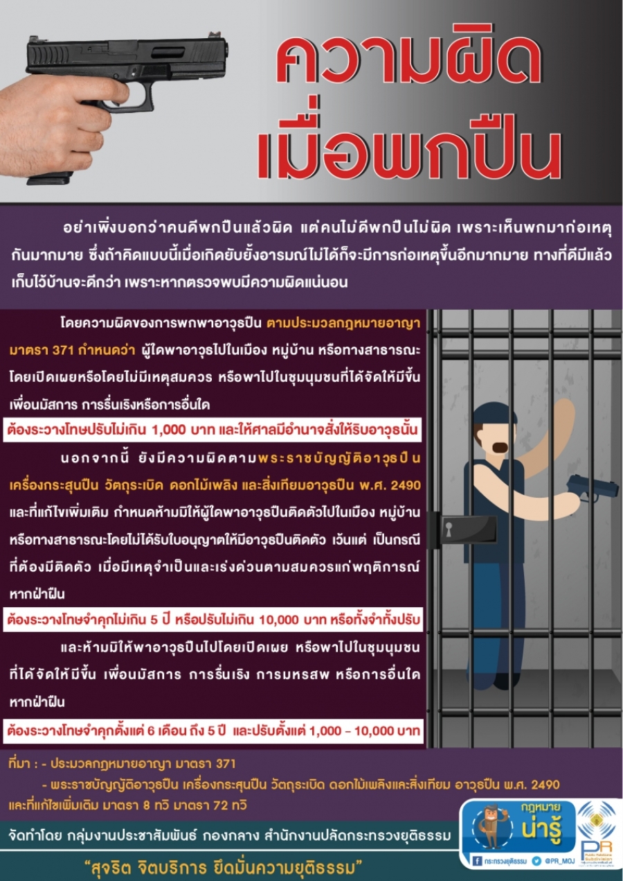 ประชาสัมพันธ์กฎหมายน่ารู้ ตอน “ความผิดเมื่อพกปืน” วันจันทร์, 23 มีนาคม 2569 15:30 Print Email back to top